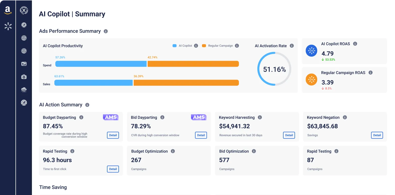 8つの高度なAIアクションを搭載したXnurta AI Copilotで、Amazon広告キャンペーンを強化。購買傾向を予測するAI分析により、広告配信と最適化の精度を飛躍的に高め、パフォーマンスを最大化します。