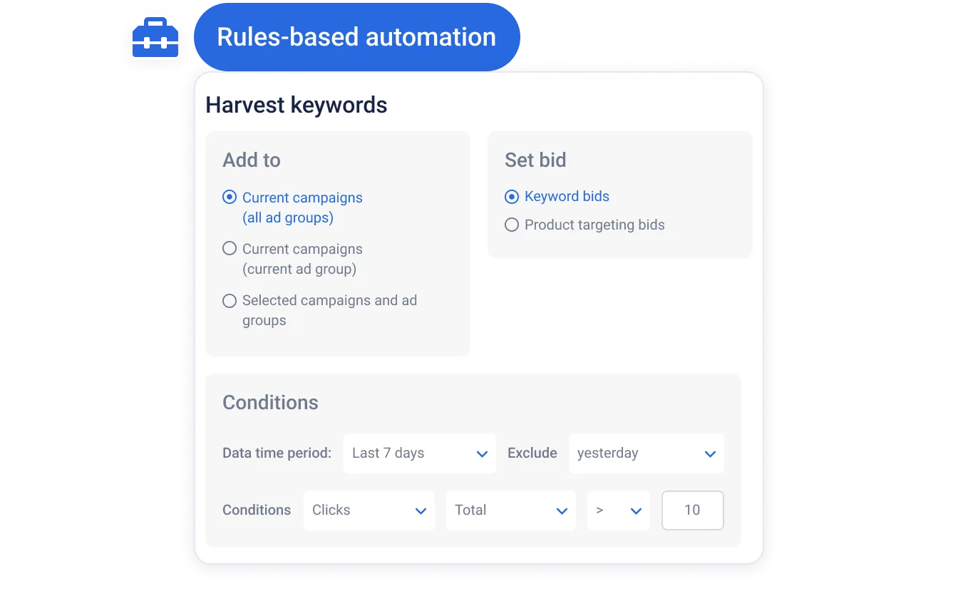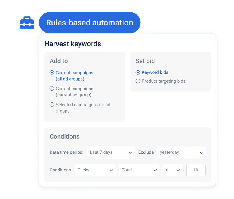 Set custom rules for automated adjustments, including bids, budgets, targeting, and ad structure based on your unique goals.